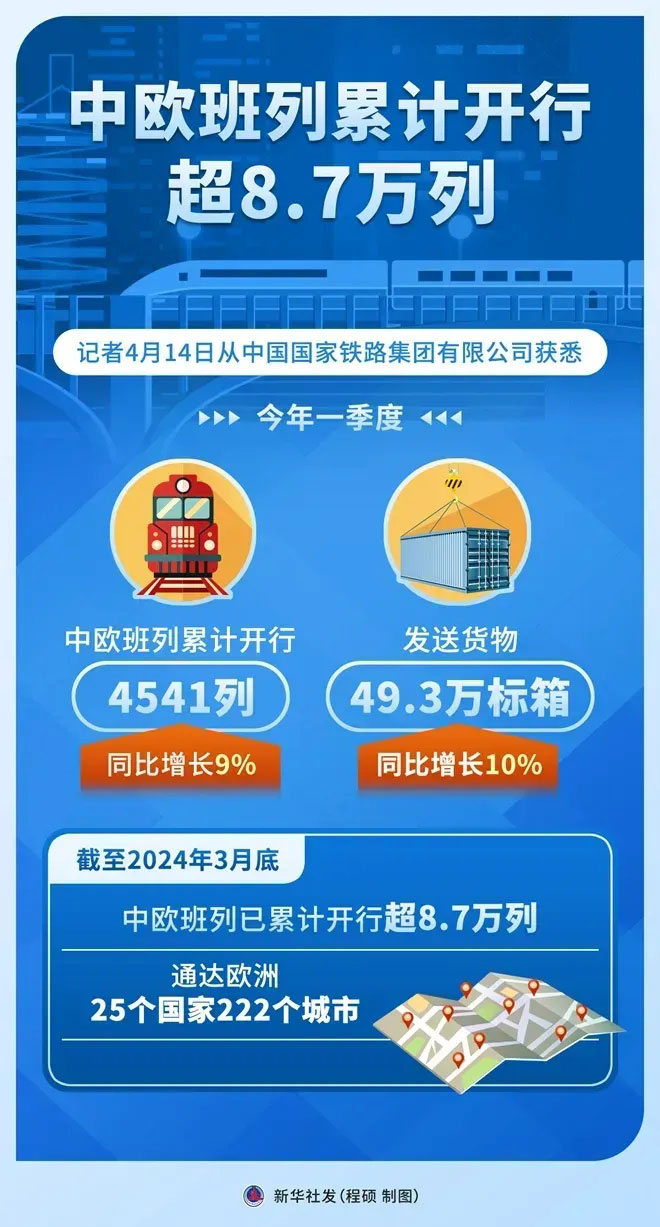 從中國國家鐵路集團(tuán)有限公司獲悉,今年一季度,中歐班列累計(jì)開行4541列,發(fā)送貨物49.3萬標(biāo)箱,同比分別增長9%、10%。截至2024年3月底,中歐班列已累計(jì)開行超8.7萬列,通達(dá)歐洲25個(gè)國家222個(gè)城市。