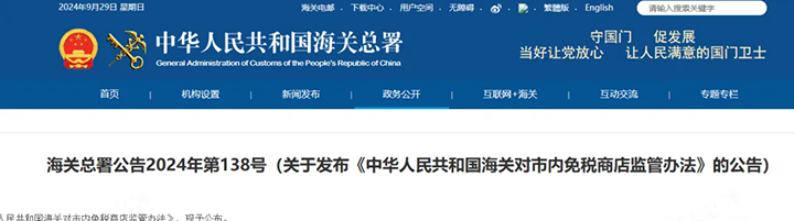 近日,海關總署公布了《中華人民共和國海關對市內免稅商店監管辦法》,自2024年10月1日起施行。